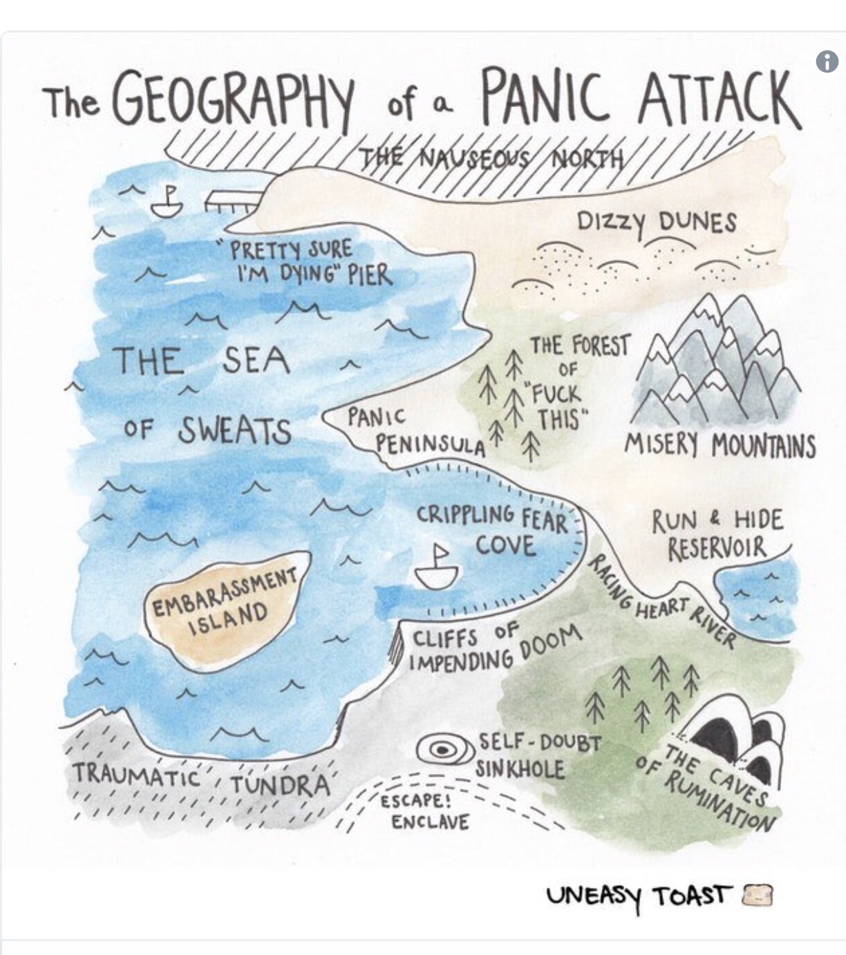 Here is a picture of “the geography of a panic attack,” by Uneasy Toast. Seeing many clients who suffer with anxiety, I hear about panic attacks…and everyone’s experience is different! It can be so scary the first time this happens, so to know others experience panic attacks can be a comfort in itself. To learn more about anxiety, go to: anxietybc.com